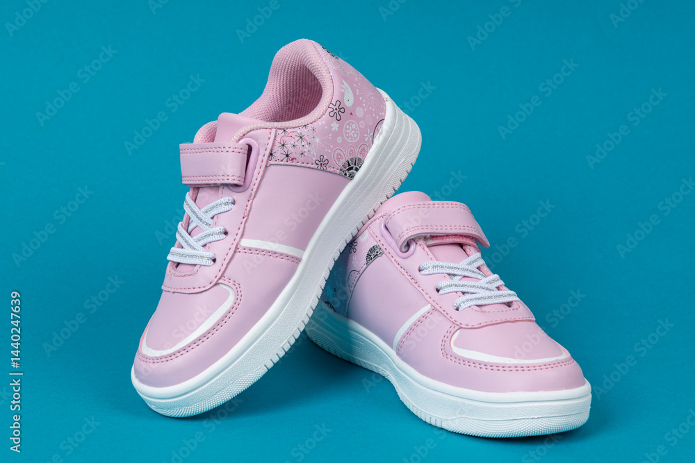 Cute Pink Kids' Fashion Sneakers: Stylish Children's Shoes with Velcro Strap on Blue Background. New Footwear Concept