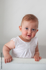 Adorable Baby Standing in Crib – Happy Infant. Perfect for Parenting, Baby Care, or Family Lifestyle Concepts