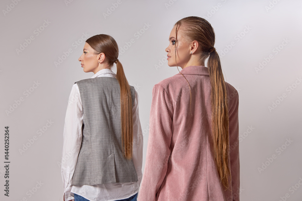 Models pose back-to-back in a studio, dressed in stylish neutral outfits with long hair pulled back. focus is on contemporary fashion and the unique textures of their clothing choices
