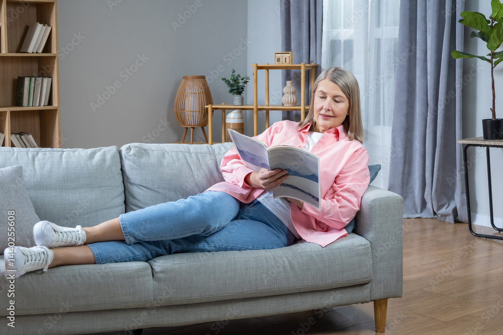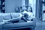 Mid aged woman reading a newspaper at home and looking involved