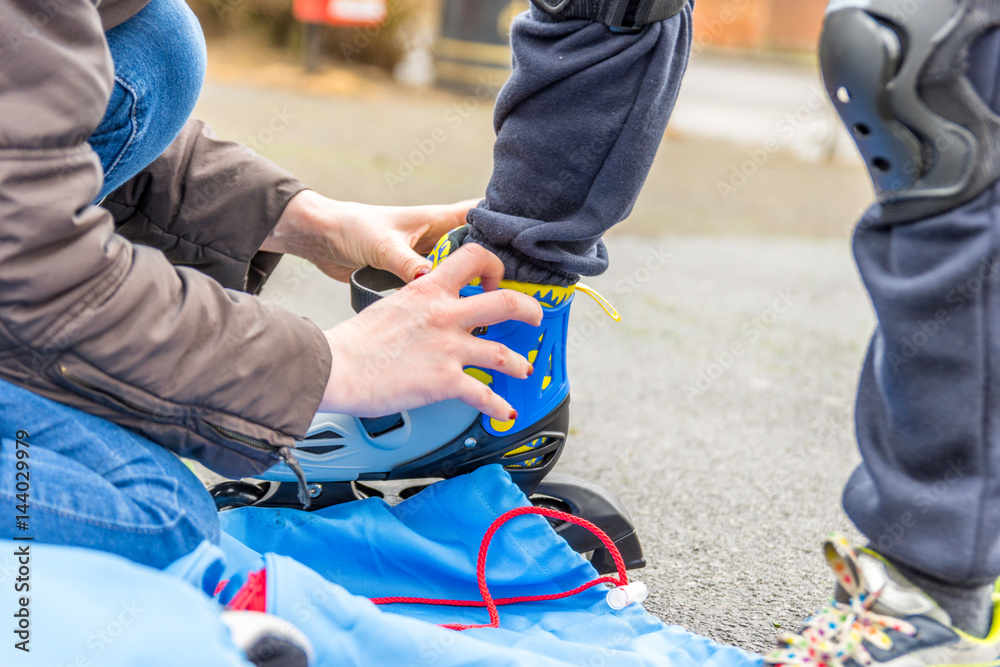 Mother helps son to get on roller skating in park