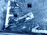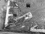 Excavator with hydraulic hammer dismantling a building at a construction site