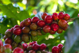 Close up red ripe coffee berries on coffee tree in rural plantation