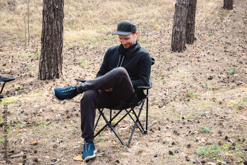 Relaxing Outdoors A Man Sitting on a Folding Chair in a Sparse Forest Environment
