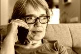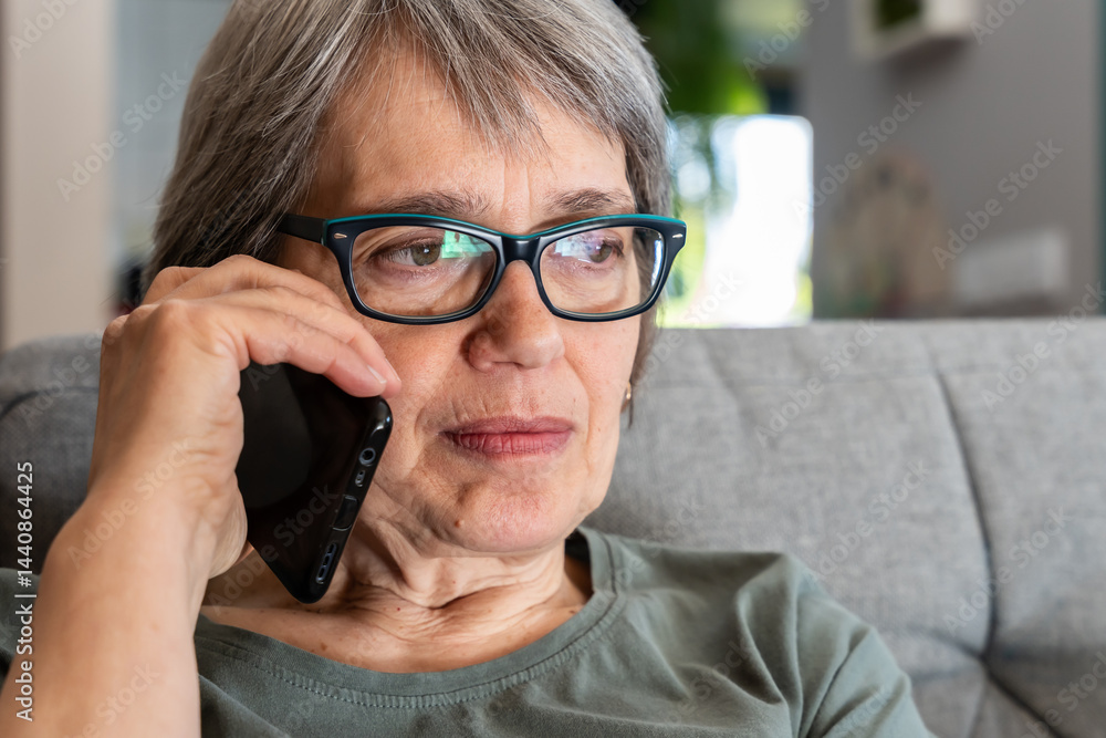 Senior woman talking on smartphone and smiling with expressive hand gesture, indoor casual conversation in Poland