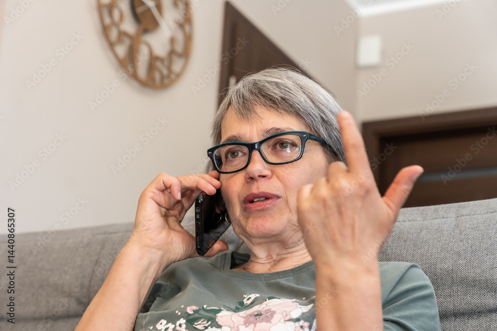 Senior woman smiling and gesturing while talking on smartphone, casual home setting, communication in Poland