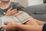 Close-up of senior woman preparing for blood pressure measurement, adjusting sleeve with cuff on arm, concept of home healthcare