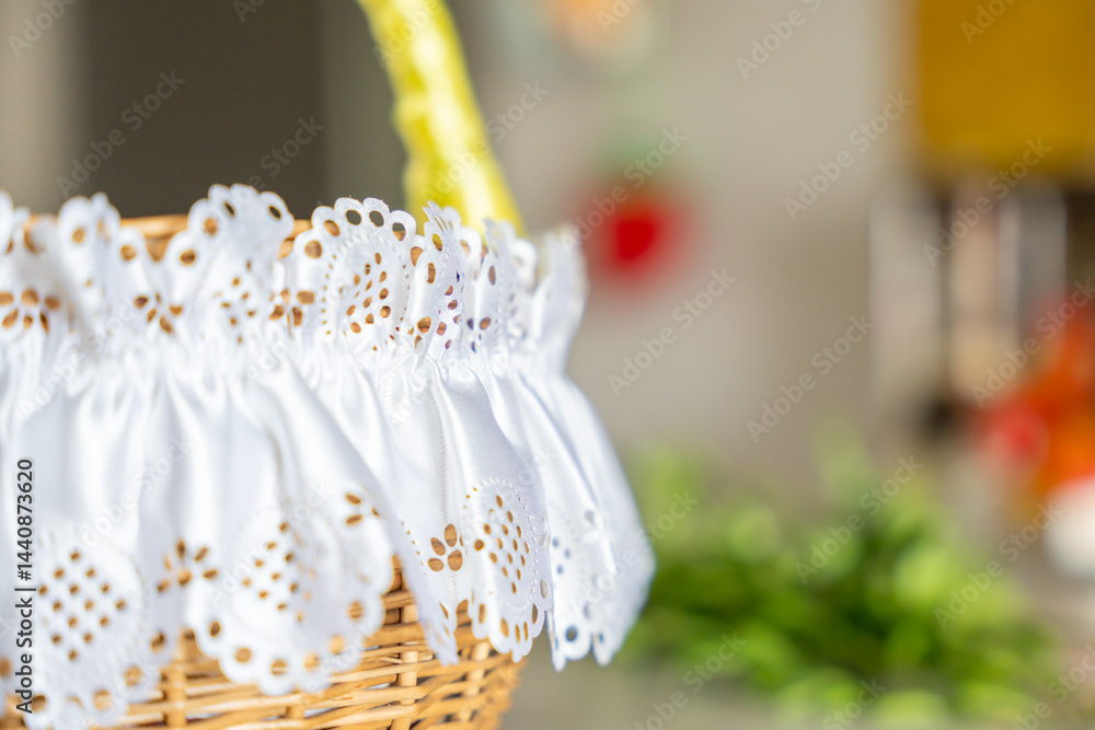 Close-up of traditional wicker basket with decorative white lace fabric, cultural item in Polish home
