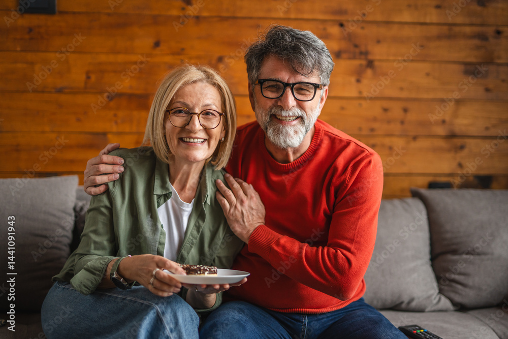 elderly man sit on sofa and watch television woman eat donuts