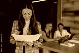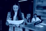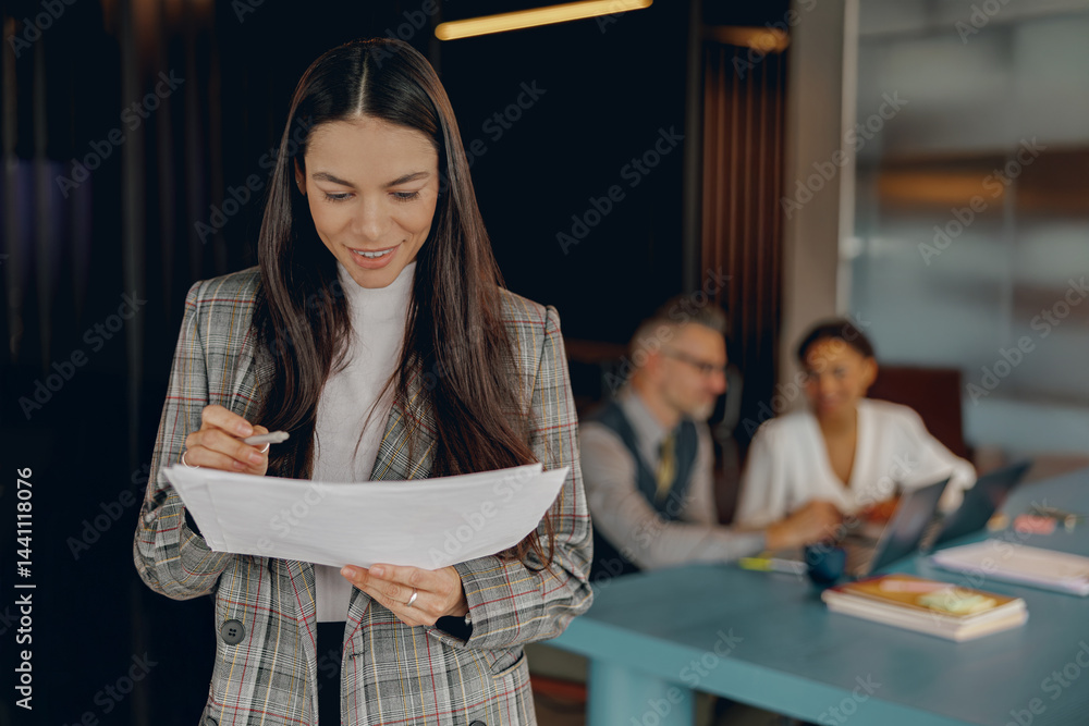 A dedicated professional studies key papers while her engaged colleagues collaborate in a bright office