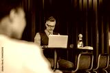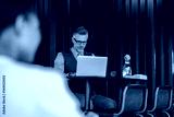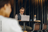 A man working on a laptop in a contemporary caf setting with a stylish ambiance