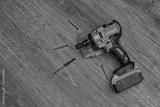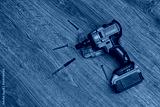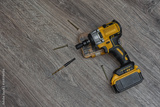 Cordless impact wrench on a wooden surface, accompanied by screws, drill bits, and a storage case. Electric tools for construction and DIY projects.