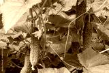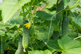 Fresh Cucumbers Growing on Vine – Green Cucumber Plant with Large Leaves and Yellow Flowers for publication, poster, calendar, post, screensaver, wallpaper, cover, website. High quality photography