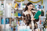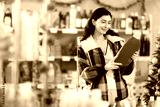 Woman holds a bottle of detergent in hands, she reads the composition of the product against the background of a Christmas tree. European woman came to the store and buys goods at New Year's discounts