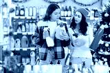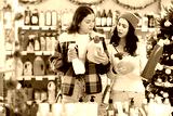 Two women choose detergents, fabric softener and sprays at great Christmas discounts and promotions. Friends come to the store and buy sets of household cleaning products for the New Year