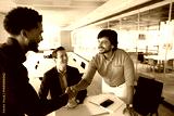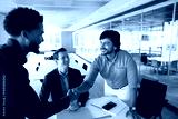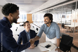 Positive Indian CEO shaking hands African client start negotiating in modern office, establish strong, trustworthy business relationships, express respect, thanking for getting professional services