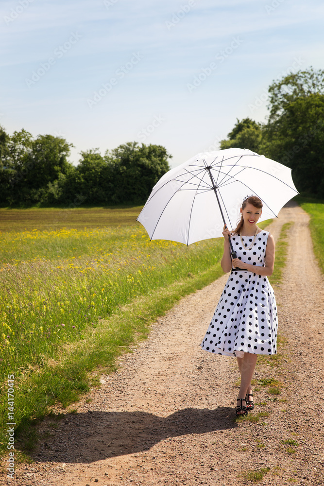 Frau im Petticoat der 50er Jahre geht mit Sonnenschirm spazieren