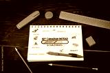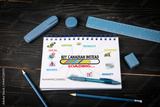 Buy Canadian Instead Loading. Notepad and blue stationery on a black wooden texture background