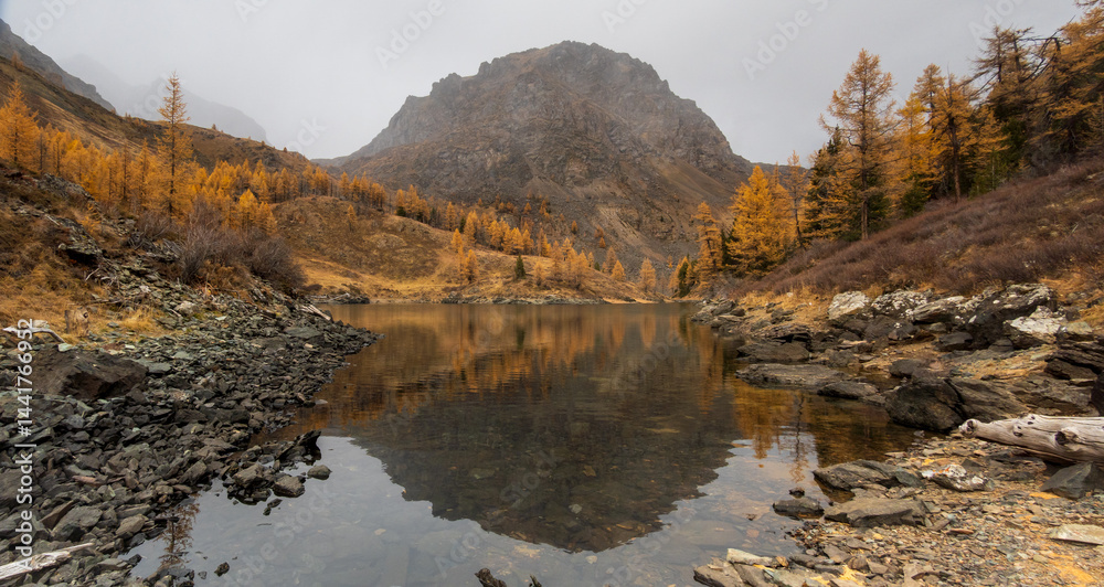 Autumn mountain landscape with golden trees and calm lake reflecting the scenery. Perfect for nature lovers.