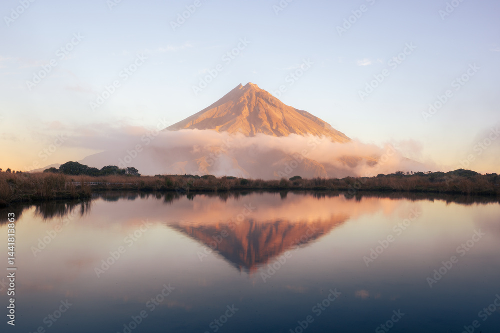 New Zealand landscape of Mt Taranaki at sunset with lake and reflection