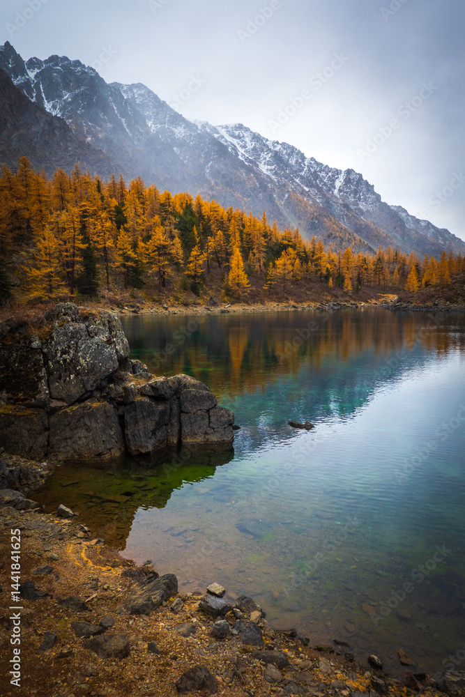 Mountain lake with clear water reflecting autumn trees and peaks. Peaceful autumn scenery of mountains and forests under overcast sky.