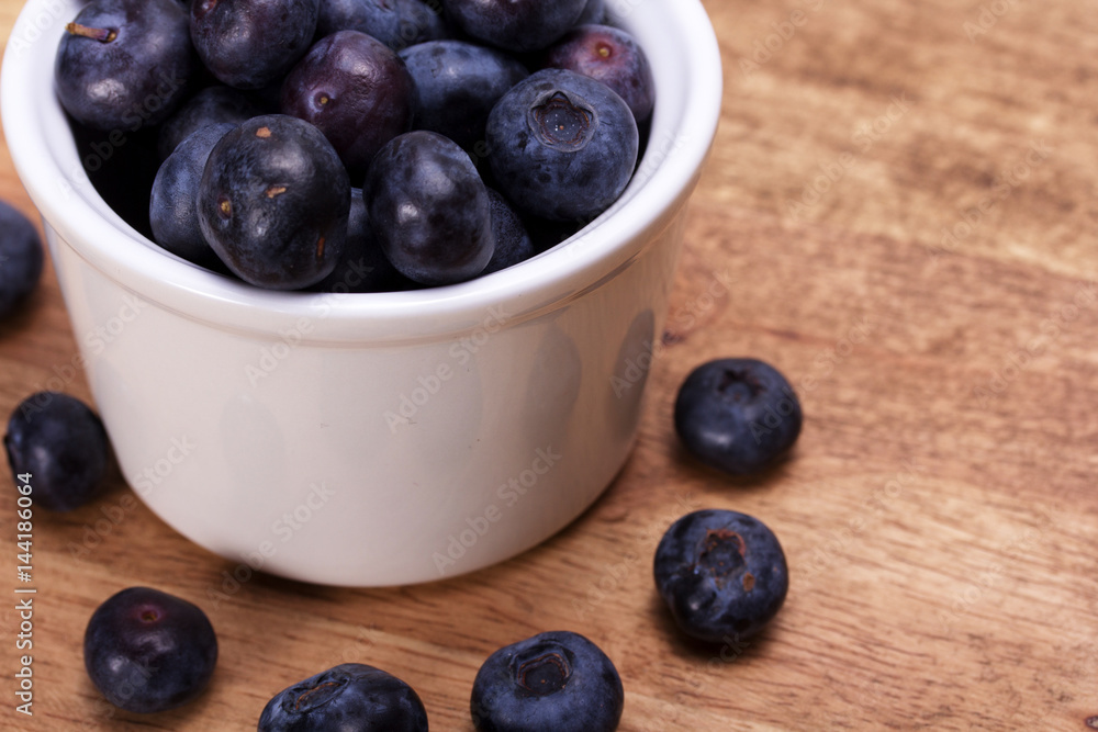 Pot of blueberries on a rustic background
