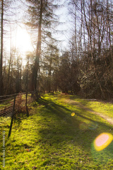 Low sun through trees in the woods