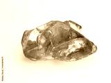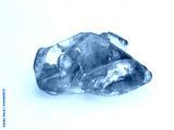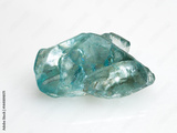 A close-up studio shot of a raw, translucent blue natural zircon crystal against a dark background showcasing its irregular facets and internal reflections