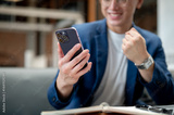 Close up of man making a fist while looking at his phone sitting with laptop in cafe or coffee shop