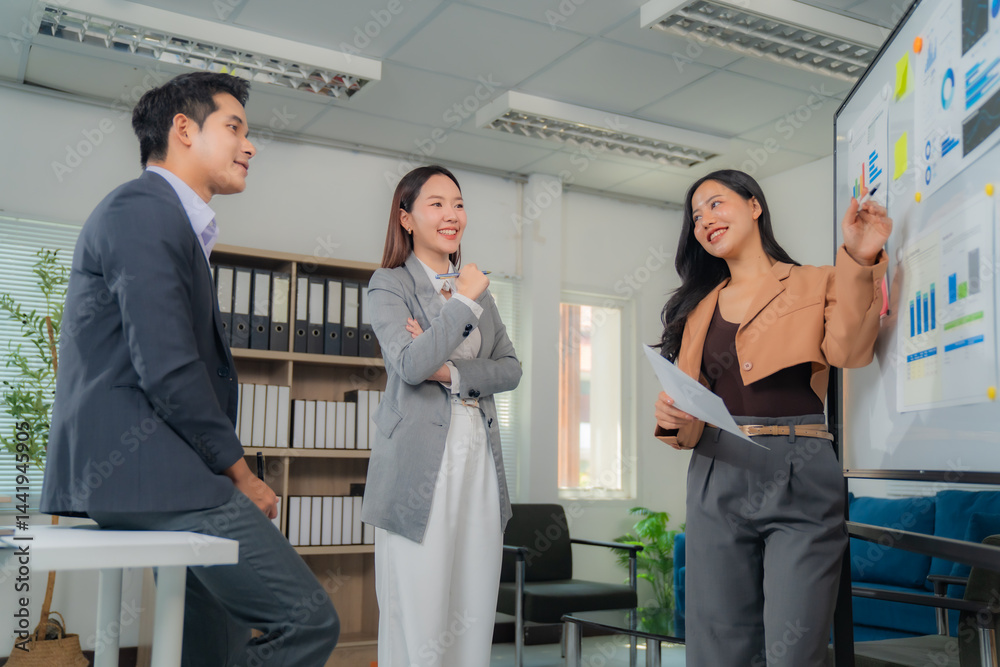 Businesswoman is holding a document and pointing at a whiteboard while presenting marketing data to her asian colleagues listening to her in the office
