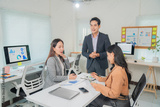 Asian businesspeople discussing and brainstorming during meeting analyzing financial charts displayed on computer screen and printed documents sitting at desk in modern office