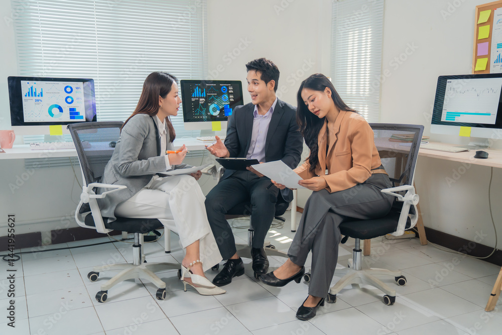 Three asian businesspeople are discussing financial data during a meeting in a modern office, analyzing charts and graphs displayed on computer screens while sitting on chairs