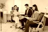 Three Asian businesspeople sitting on modern chairs, collaborating and analyzing financial documents during a productive meeting in a bright, contemporary office space