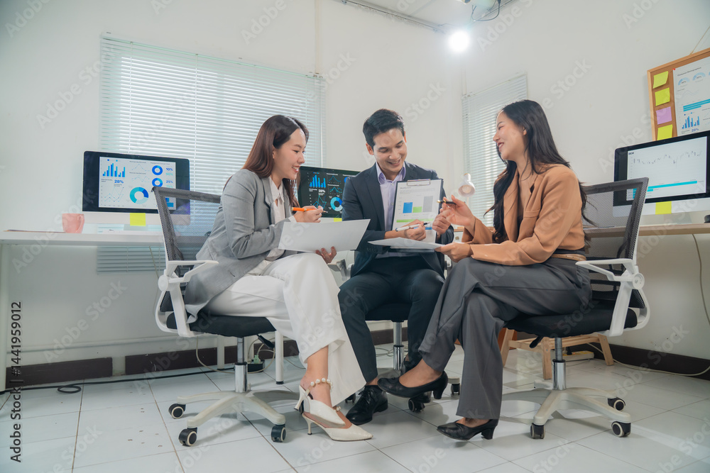 Three asian businesspeople sitting in office chairs and discussing company strategy by analyzing financial reports, using data displayed on computer screens and taking notes on documents