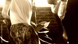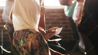 A person wearing a floral top and headscarf holds a paper in a sunlit room. The focus is on the headscarf and paper, with others blurred in the background. Diverse people sitting in seminar.