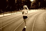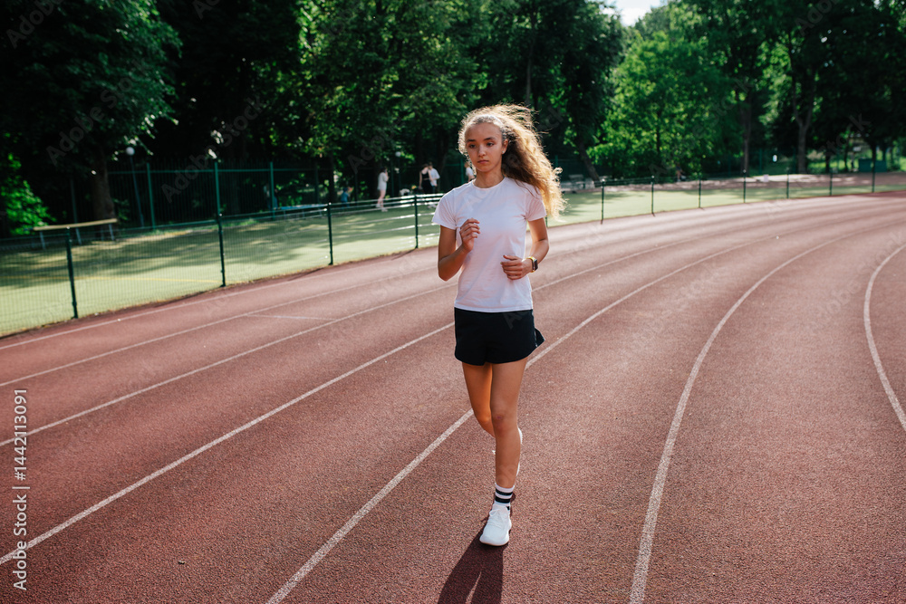 Teenage girl training at the stadium, doing track and field exercises, running and performing various athletic drills.