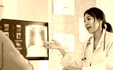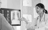 Doctor reviewing lung x-ray and diagnosing patient for respiratory disease at hospital consultation