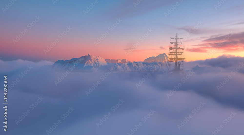 An old sailing ship moves through the fog on a glacier