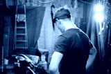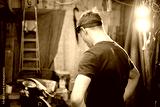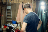An Enthusiastic Mechanic Examining His Motorcycle in a Cluttered Garage Workshop with Tools and Equipment