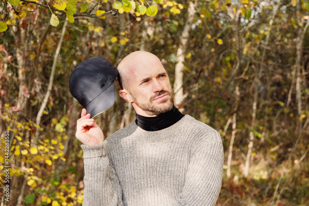 Contemplative Man in Nature Holding Hat Capturing Candid Moment During Autumn Season Surrounded by Golden Foliage and Sunlight