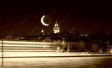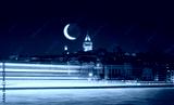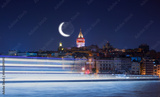 Galata Tower, Galata Bridge, Karakoy district and Golden Horn with motion speed light of passing ferry in the foreground at night istanbul - Turkey