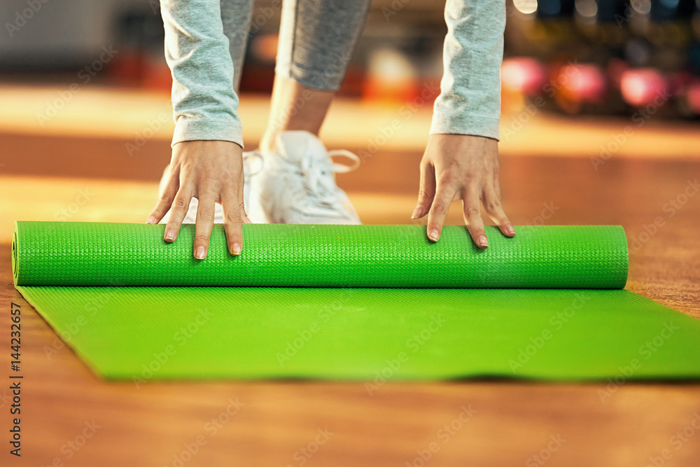 Rolling Yoga Mats After Class. Woman in the Gym.