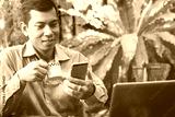 Asian businessman smiles while receiving a text message from the smartphone.Vintage Style.