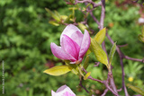 Blooming tree branch with pink Magnolia soulangeana, Alba Superba flowers in park or garden on green background with copy space. Nature, floral, gardening, plant breeding.