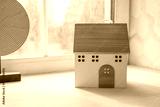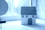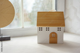 Small decorative toy house made of wood sits on bright windowsill. Home decor, detail of interior design for children room.