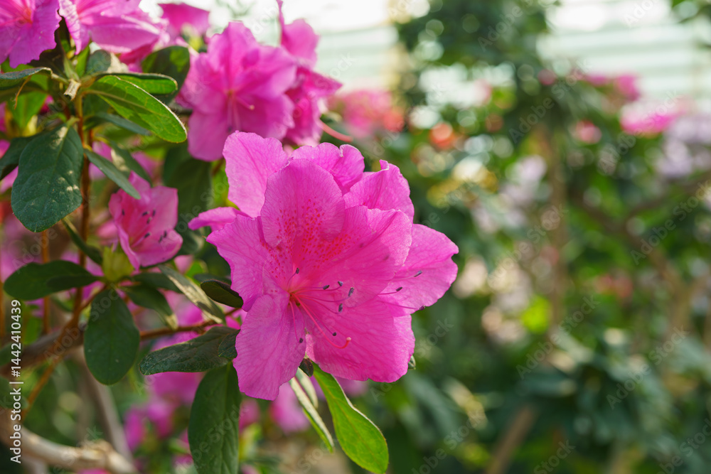 Blooming pink japan Azalea Ericaceae flowers, rhododendron flower macro, background. Evergreen decorative plant outdoor or in orangery in botanical garden. Gardeining, plant breeding