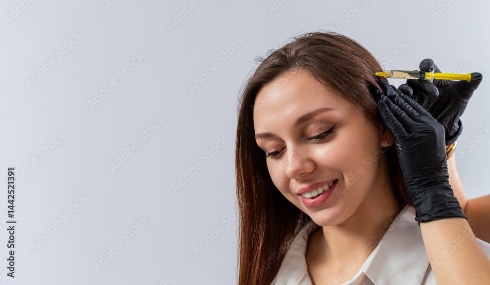 Hair loss, alopecia treatment, prp. Hair strengthen and growth, needle mesotherapy. Woman getting cosmetics injection in head, copy space. Young woman with hair loss problem receiving injection