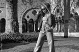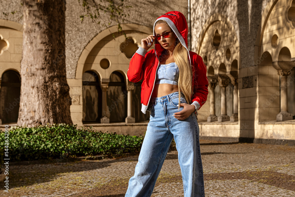 Summer fashion street style with young fashionable woman in red jacket, sunglasses and jeans in the city on a sunny summer day. Denim fashion.