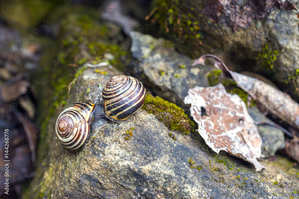 Vibrant spring macro scene of mossy garden rocks and two snails mating