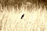 Small red wing blackbird perched among light spring reeds, beautiful contrast